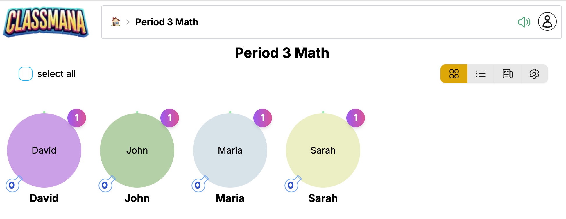 學生網格是預設檢視,將每個學生顯示為視覺卡片。