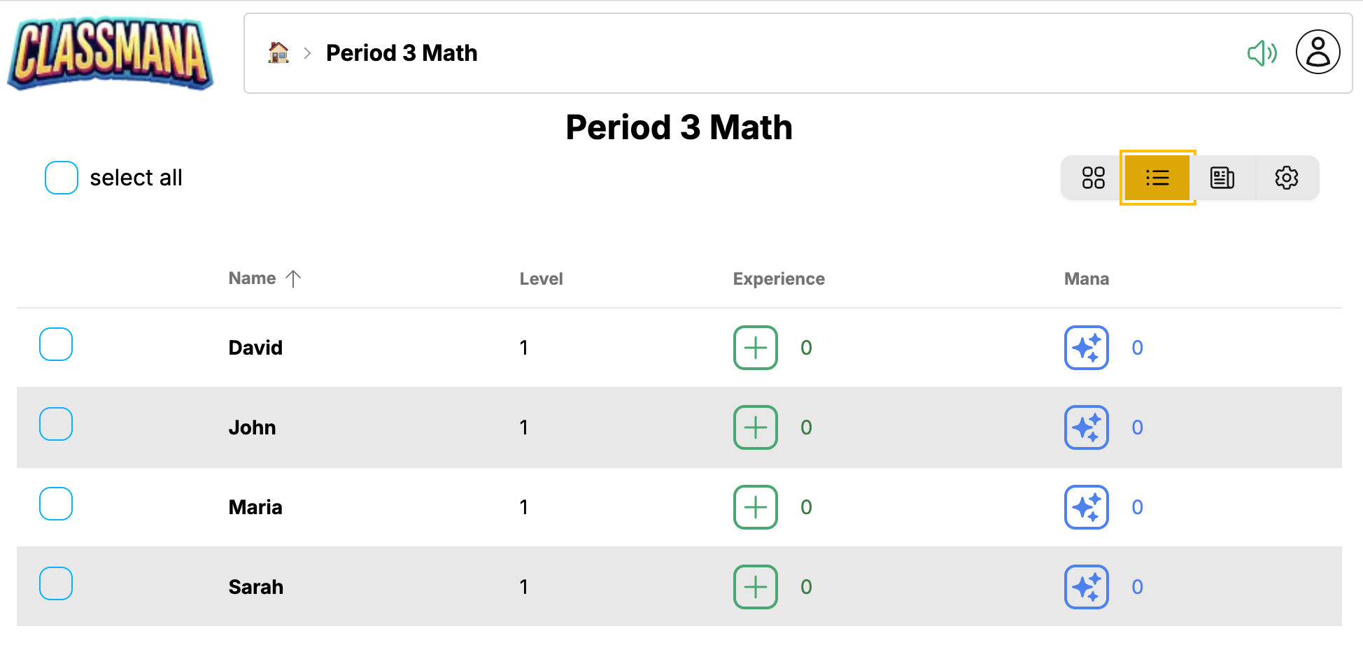 學生表格提供班級的緊湊、類似試算表的檢視。